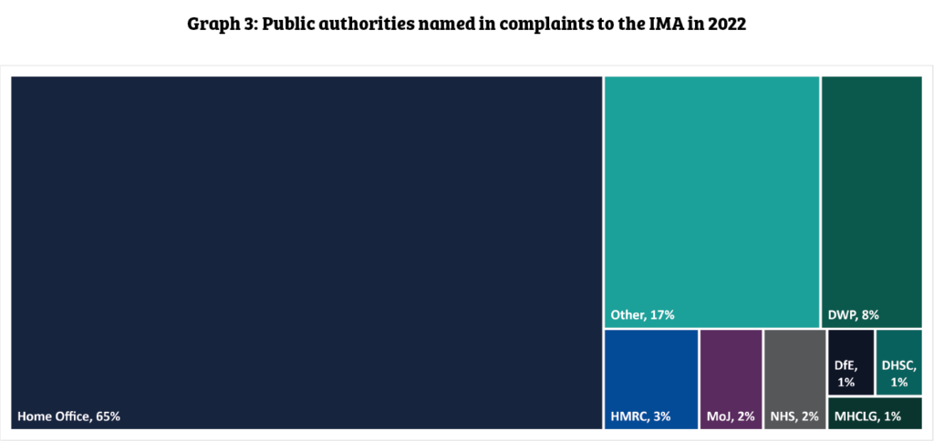 Graph 3 (above) demonstrates that most of the complaints reported to the IMA relate to the Home Office, followed by a smaller group of complaints in the “other” category that are a collective of public bodies, including Local Authorities, Student Finance England, DVLA, DEFRA, and DfT. The third largest group of complaints relate to Department for Work and Pensions (DWP).