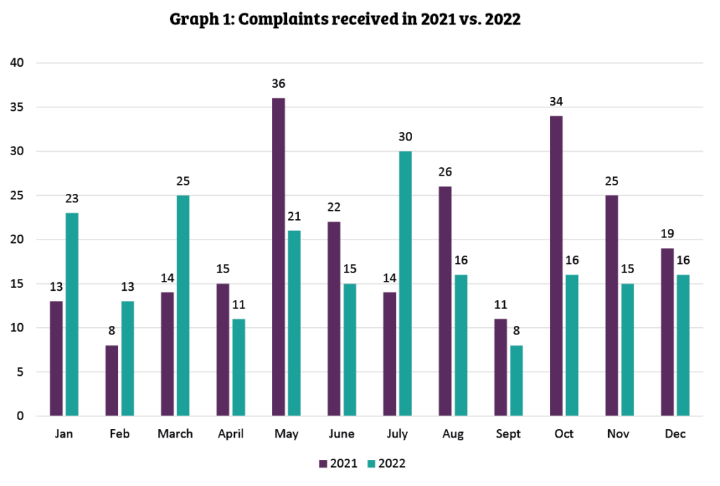 The IMA received 209 complaints from 1 January to 31 December 2022. This is slightly lower than the 237 complaints received in 2021.