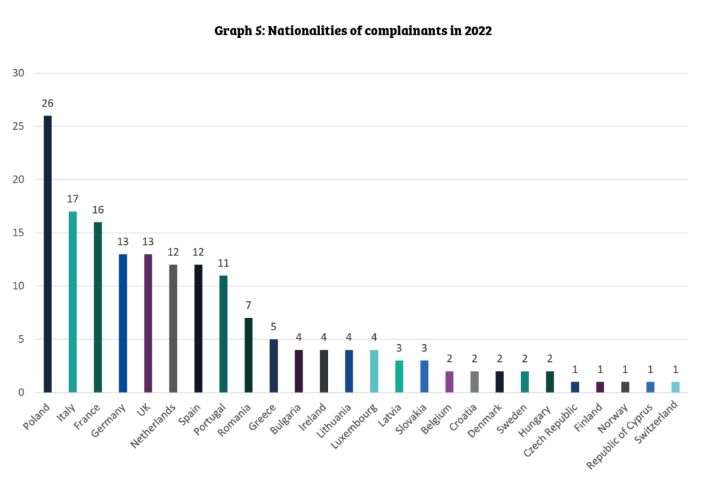 Finally, graph 5 (above) shows the nationalities of those who made complaints to the IMA in 2022. In 2022 we received complaints from citizens of 80% of EU and EEA EFTA countries. We are yet to receive any complaints from citizens who are from Estonia, Iceland, or Lichtenstein.