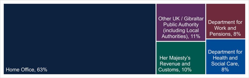 For a complaint to the IMA to be treated as in scope, part of our assessment involves identifying if a public authority is being complained about. For complaints that are in scope, the graph below (Graph 3) demonstrates that the majority of these complaints relate to the Home Office, followed by HMRC, DWP and DHSC.