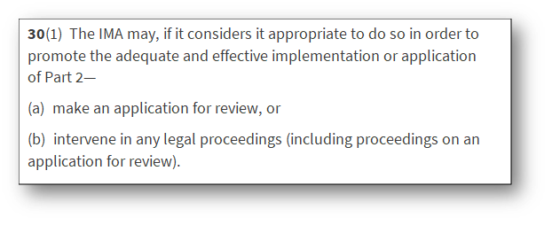The EUWAA confers a number of functions on the IMA, including the power to take legal action, whether by bringing review proceedings of its own volition or intervening in any legal proceedings (including those of review).